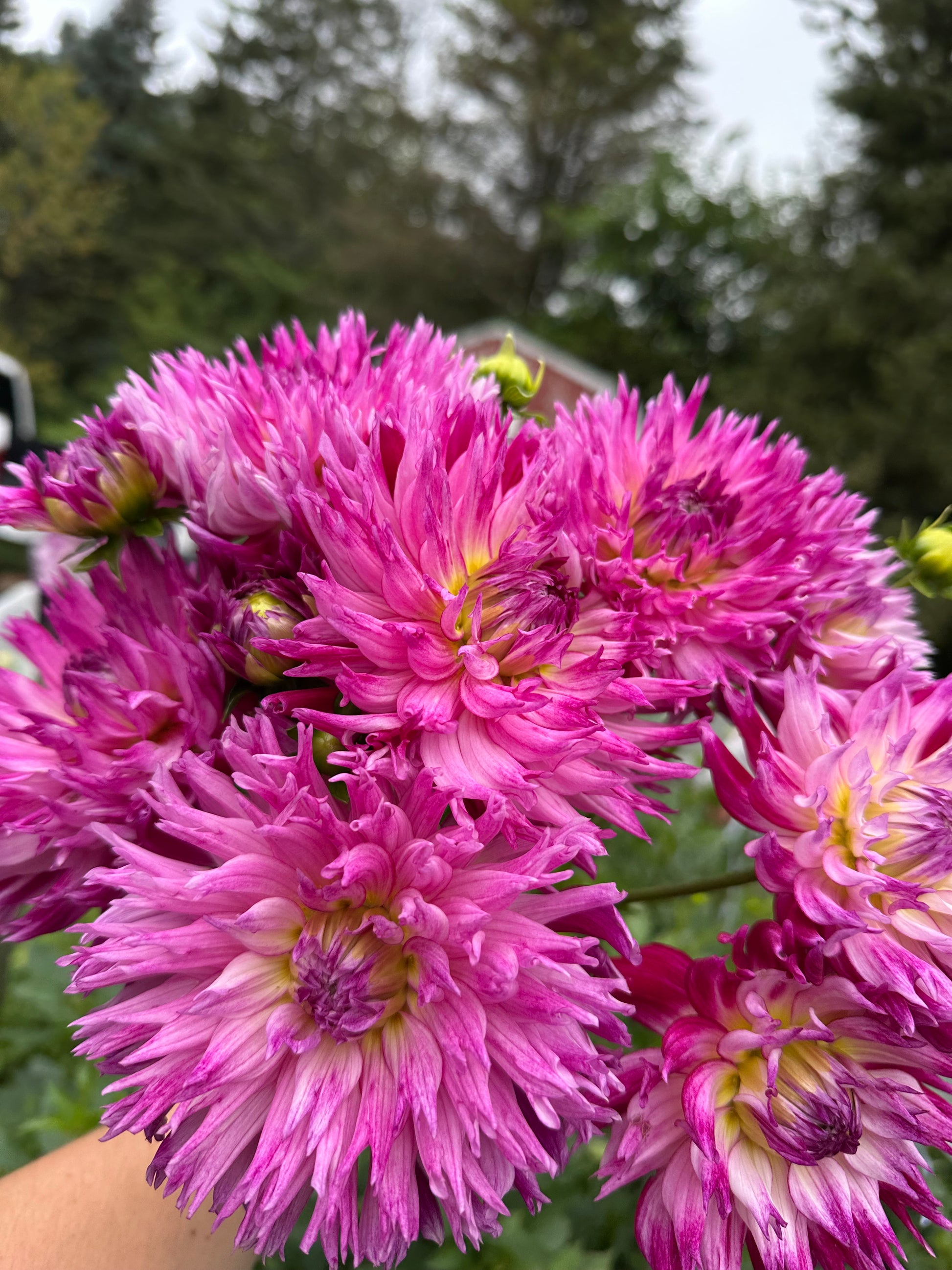 Small semi-cactus, dark purple, lighter purple, white blend. 4-5 inch blooms on 4-5 foot plants in our field