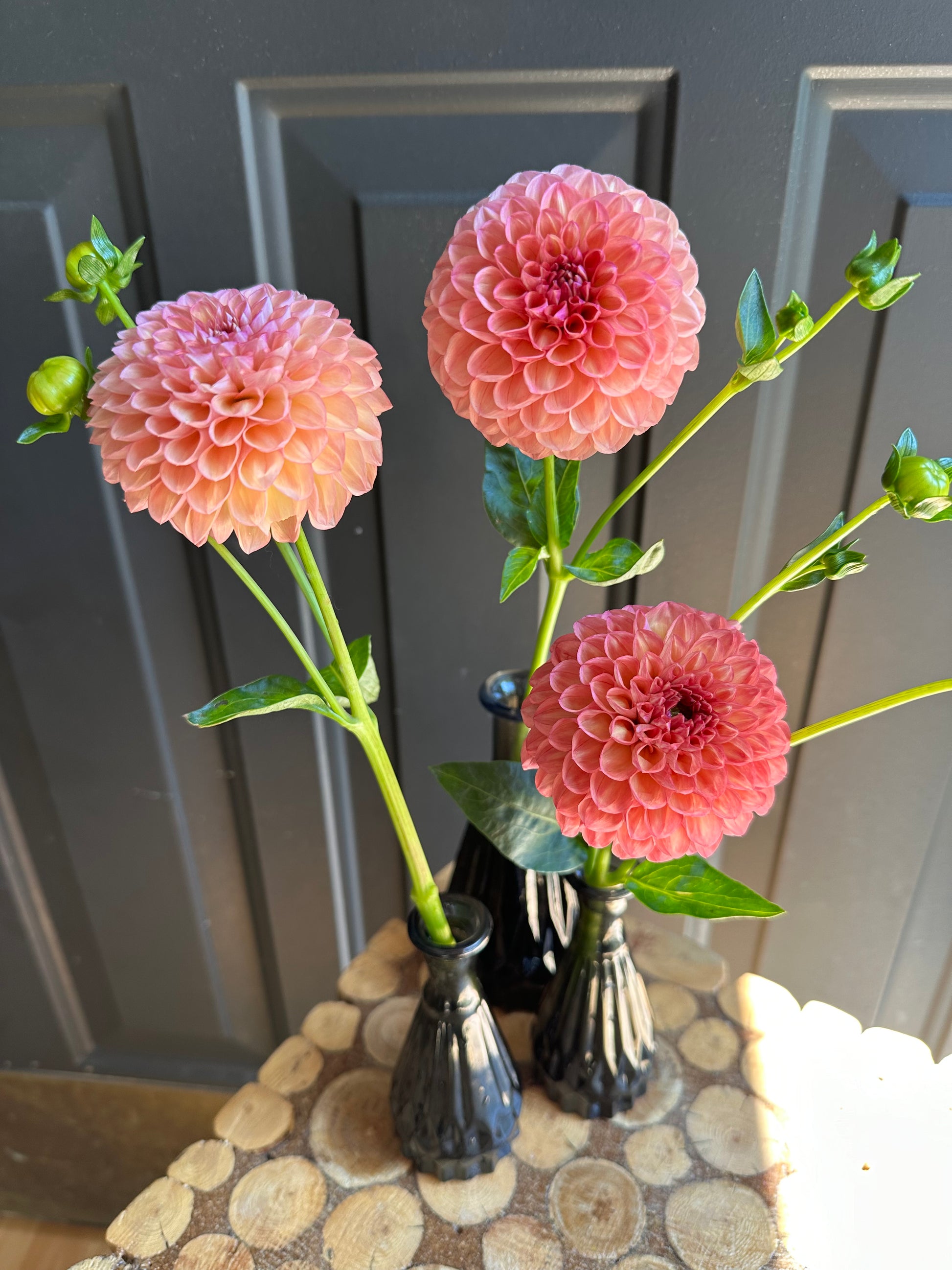 3.5 inch blooms on a 3.5 foot tall plant. Ball form, coral coloring with hints of orange and pink